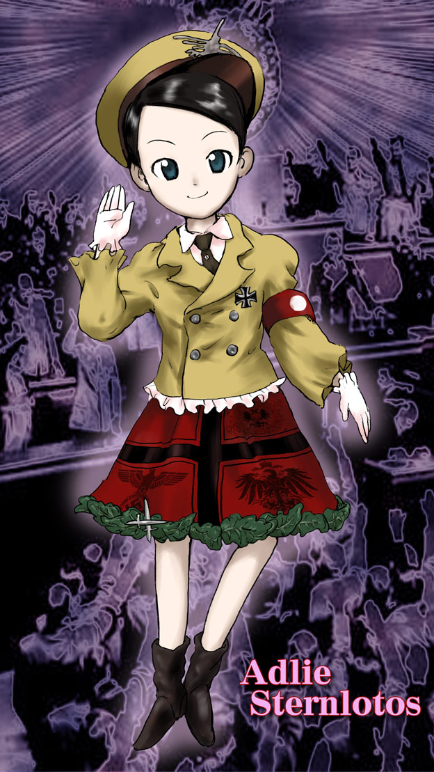 一応解説しておきますと、帽章がナスカの地上絵なのは彼女が古代文明に興味を持っていたためと、南米に逃げたかもしれない事の暗示。スカートの模様は時計回りに神聖ローマ帝国・ドイツ帝国・第三帝国の紋章や国章。左上が無地なのは、第四帝国が「これから作られる」事を意味する。スカート縁の飾りは勲章などによく用いられた柏葉と剣のイメージ。